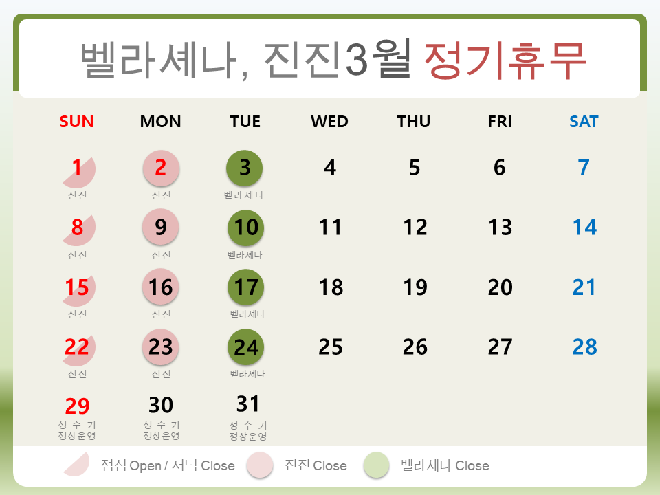 호텔 영일대 2026년 3월 정기휴무 안내 페이지 정보 작성자 영일대 작성일26-03-06 12:03 조회74회 관련링크 다음글 목록 본문 호텔 영일대 3월 식당 정기휴무 안내 드립니다.벚꽃 개화 성수기로 인하여 兩식당 3월29일부터 4월 12일 무휴운영입니다. 다음글 목록